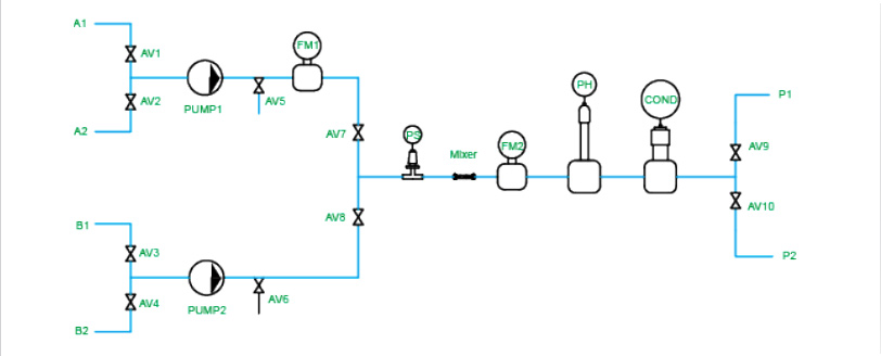 主要配液單元采用兩個泵,實現樣品A和B在一定比例下 混合均勻,滿足目標PH±0.1,電導±0.1ms/cm